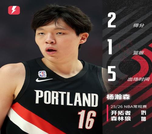 杨瀚森NBA常规赛首秀出战5分钟得到2分1篮板